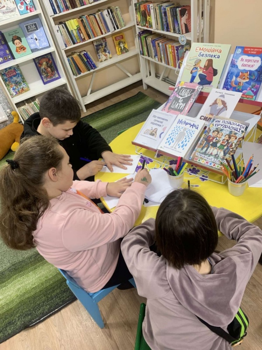 Особливе зацікавлення викликала вправа “5 доріг допомоги”: діти малювали долоньки та на кожному пальці позначали одну важливу людину чи місце, куди можна звернутися за підтримкою. Це допомогло дітям усвідомити, що поруч завжди є ті, хто готовий допомогти — друзі, батьки, вчителі, бібліотекарі, служби підтримки.