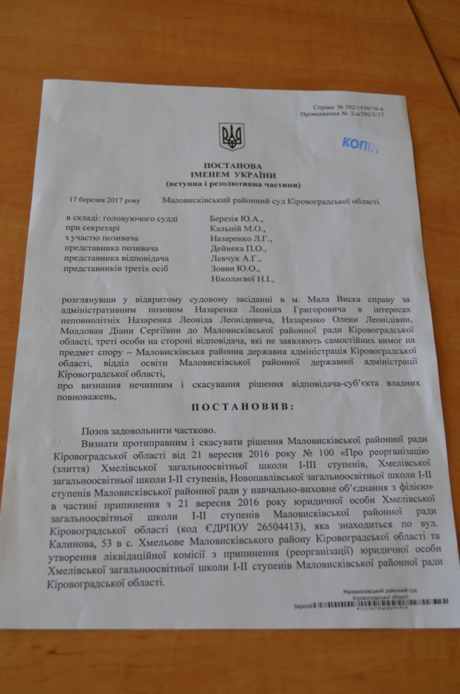Нагадаємо, що Хмелівську ЗШ І-ІІ ступенів закрили без урахування думки громади та освітян. З того часу люди зверталися до чиновників усіх рівнів, проводили низку акцій протесту, кілька гучних прес-конференцій, навіть упродовж 5 годин блокували трасу державного значення Кропивницький-Умань. Але найважливіша боротьба хмелівчан за збереження школи тривала у судовій площині. 17 березня 2017 року відбулося фінальне судове засідання за позовом голови батьківського комітету школи Леоніда Назаренка щодо неправомірного закриття сільської школи. Суд визнав протиправним і скасував рішення Маловисківської районної ради від 21 вересня 2016 року, яким була ліквідована Хмелівська загальноосвітня школа І-ІІ ступенів, в частині, що стосується цього закладу.