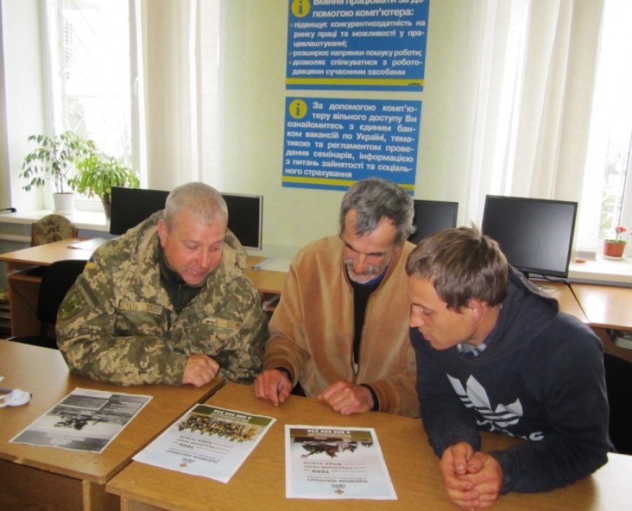 Представник районного військового комісаріату майор Ігор Свірідов докладно розповів шукачам роботи про порядок відбору громадян України на військову службу за контрактом та в резерв Збройних сил України, до навчальних частин та інших військових формувань на посади рядового, сержантського та офіцерського складу. Ознайомив з основними вимогами до претендентів та пільгами і гарантіями для військовослужбовців, поінформував і про переваги грошового, медичного, житлового та пенсійного забезпечення.