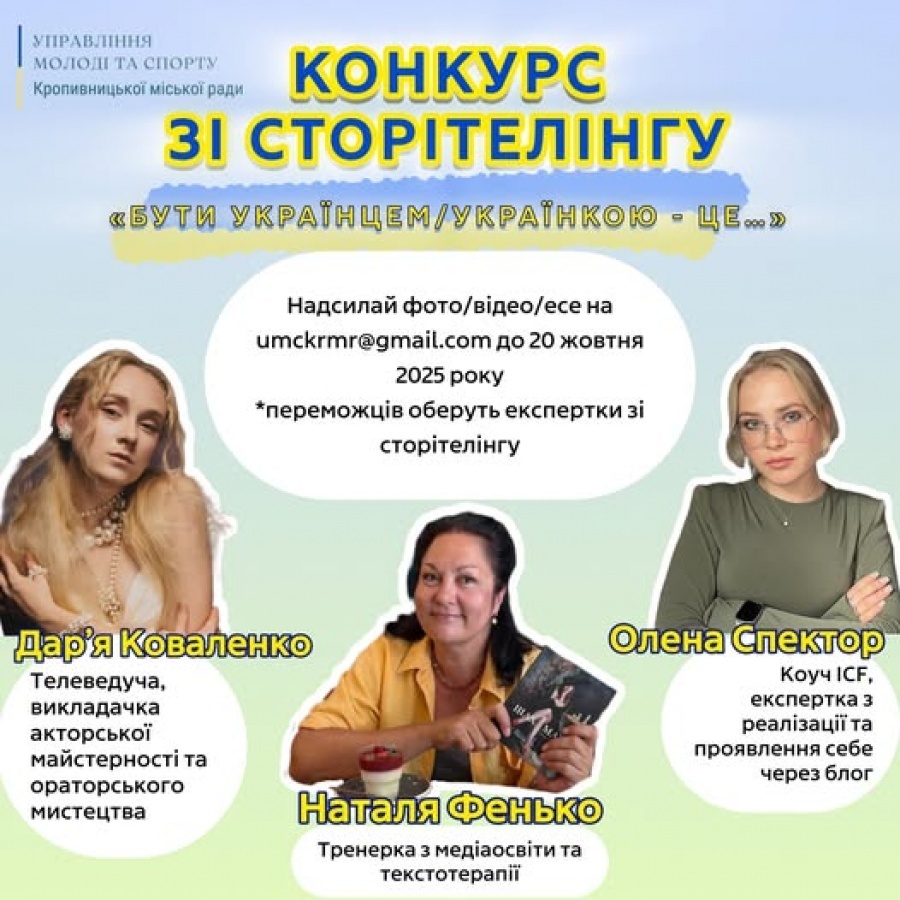 До тижня української мови у Кропивницькому оголошено конкурс зі сторітелінгу «Бути українцем/українкою – це…». Його мета — надихнути молодь поділитися власними історіями про українську ідентичність, силу слова та щирість переживань.