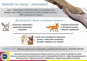 Нагадуємо: сказ – особливо небезпечне інфекційне захворювання вірусної етіології, яке уражає центральну нервову систему тварин і людини, закінчується летально. Сказ не лікується!!! Джерелом інфекції сказу тварин є хворі тварини, які виділяють вірус сказу зі слиною та передають здоровим тваринам або людині через укуси, подряпини або контакт з відкритими ранами. Найчастіше це: дикі м’ясоїдні тварини, такі як червоний лис, вовк, єнотовидний собака, кажани; безпритульні та домашні тварини - собаки, коти, які не були вакциновані та контактували з хворими тваринами. Особливо небезпечними є тварини на стадії клінічного прояву сказу, коли у них спостерігаються підвищена агресивність, слинотеча та порушення координації.
