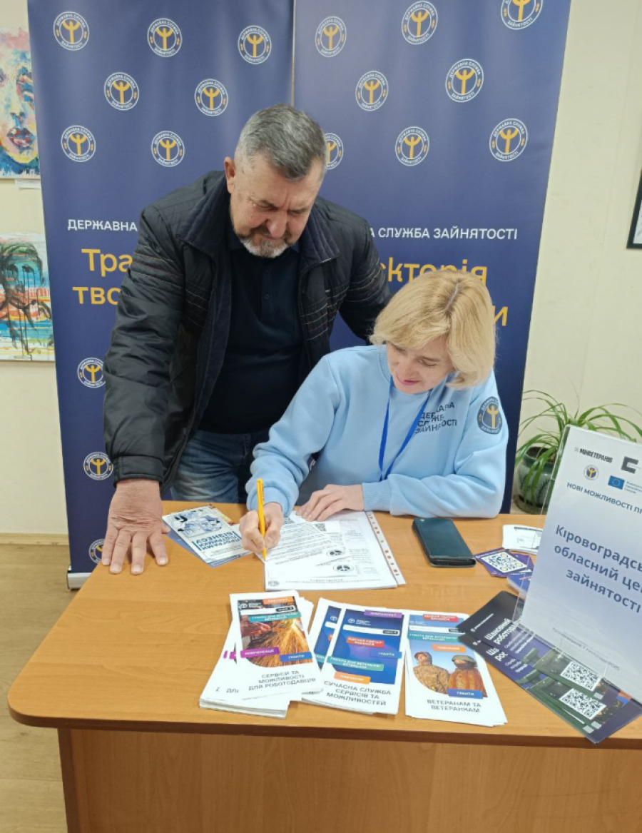 Водночас Юлія Андрєєва,начальник управління організації надання послуг Кіровоградського обласного центру зайнятості, надавала консультації тим, хто наразі має на меті скористатися допомогою у пошуку роботи. В’ячеслав із с. Кам’янецьке, маючи протез, шукає роботу, яка б відповідала його фізичним можливостям і дозволяла реалізувати професійний потенціал. Він прагне знайти справу, яка була б не лише посильною, а й приносила задоволення та відчуття корисності. Завдяки підтримці фахівців служби зайнятості ветеран розглядає варіанти, що враховують його індивідуальні потреби, і відкритий до нових можливостей, зокрема – професійного навчання або перекваліфікації.