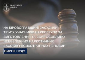 У Кропивницькому суд завершив розгляд справи щодо діяльності наркогрупи, яка тривалий час виготовляла та збувала особливо небезпечні психотропні речовини. Трьох чоловіків визнано винними та призначено реальні строки ув’язнення.