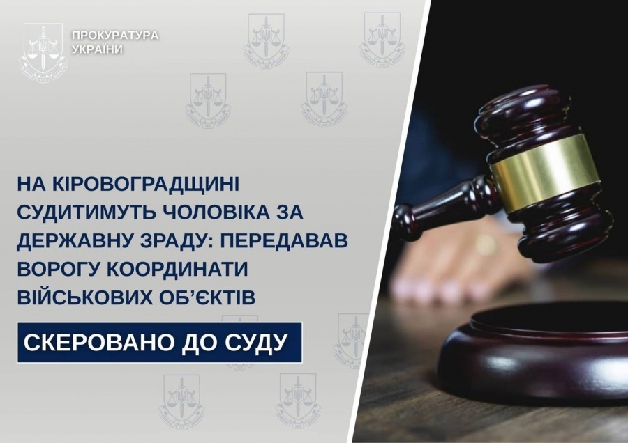 Прокурори Кіровоградської обласної прокуратури скерували до суду обвинувальний акт щодо мешканця Кропивницького, який під час дії воєнного стану співпрацював із спецслужбами російської федерації. Йому інкримінують державну зраду, вчинену в умовах воєнного стану (ч. 2 ст. 111 КК України — від 15 років до довічного позбавлення волі з конфіскацією майна).