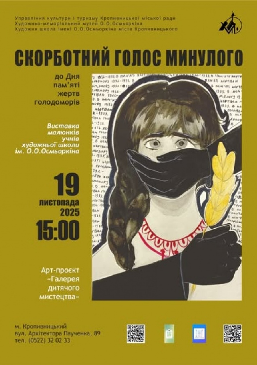 До Дня пам’яті жертв голодоморів, який відзначається в Україні щороку в четверту суботу листопада, у Кропивницькому художньо-меморіальний музей Олександра Осмьоркіна презентував виставку малюнків учнів художньої школи імені О.О.Осмьоркіна «Скорботний голос минулого». Виставка влаштована в рамках арт-проєкту «Галерея дитячого мистецтва» за ініціативи заступниці директора художньої школи Тетяни Бондарь, повідомила директорка музею Віта Чернова.