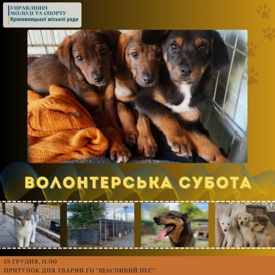 У Кропивницькому небайдужу молодь запрошують долучитися до важливої та доброї справи – Волонтерської суботи, присвяченої допомозі беззахисним тваринам у притулку громадської організації «Щасливий пес».