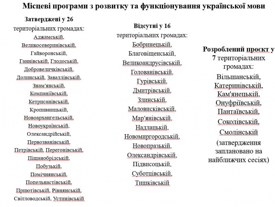 Окремо під час засідання проаналізували стан виконання державної мовної політики на рівні територіальних громад. Станом на грудень поточного року програми розвитку та функціонування української мови ухвалені у 26 з 49 громад області. Ще у семи громадах такі програми перебувають на етапі розгляду та затвердження. У 16 громадах відповідні програми відсутні.