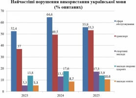 За результатами опитування, найчастіше порушення мовного законодавства респонденти фіксують у сфері обслуговування споживачів, транспорті та закладах спорту. У 2025 році на сферу обслуговування вказали 55,9% опитаних, на транспорт — 53,3%, на заклади спорту — 17,3%. У закладах охорони здоров’я цей показник становить 13,9%, у закладах освіти — 10,6%.