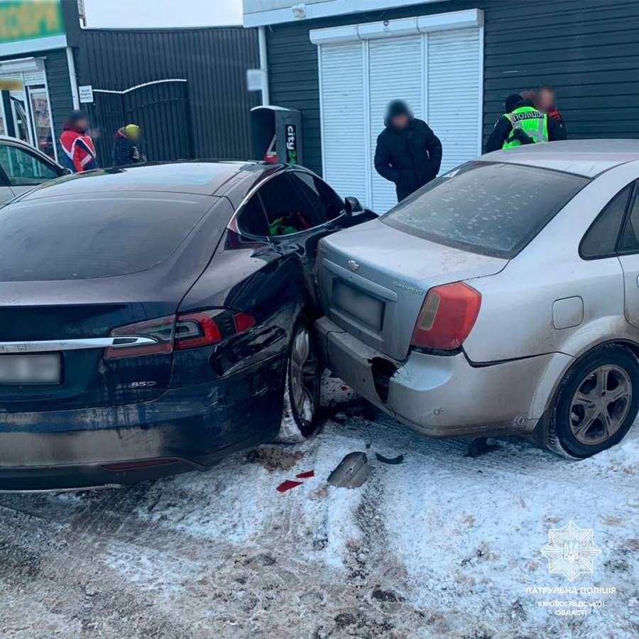 Водійка автомобіля Chevrolet Lacetti під час повороту праворуч не дотрималася безпечної швидкості руху, не врахувала дорожню обстановку, виїхала за межі проїзної частини та скоїла наїзд на припаркований легковик Tesla Model S і ролет магазину.