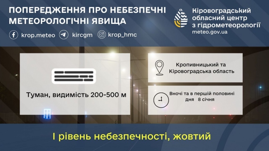 Кіровоградський обласний центр з гідрометеорології повідомляє, що в першій половині дня 8 січня утримається туман, видимість 200-500 м.