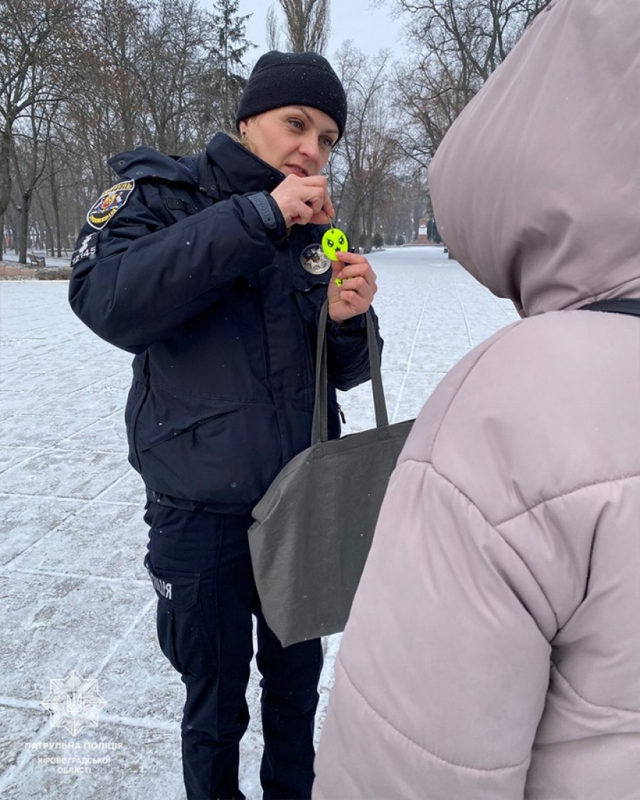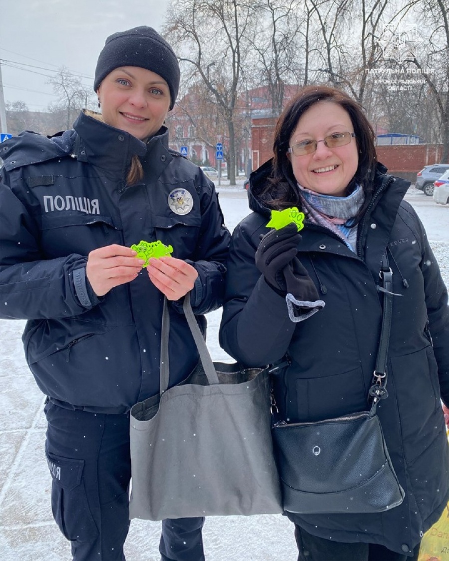 Також поліцейські подарували їм гарні, яскраві і модні аксесуари — флікери. Це спеціальні брелоки, які відбивають світло фар у темряві.