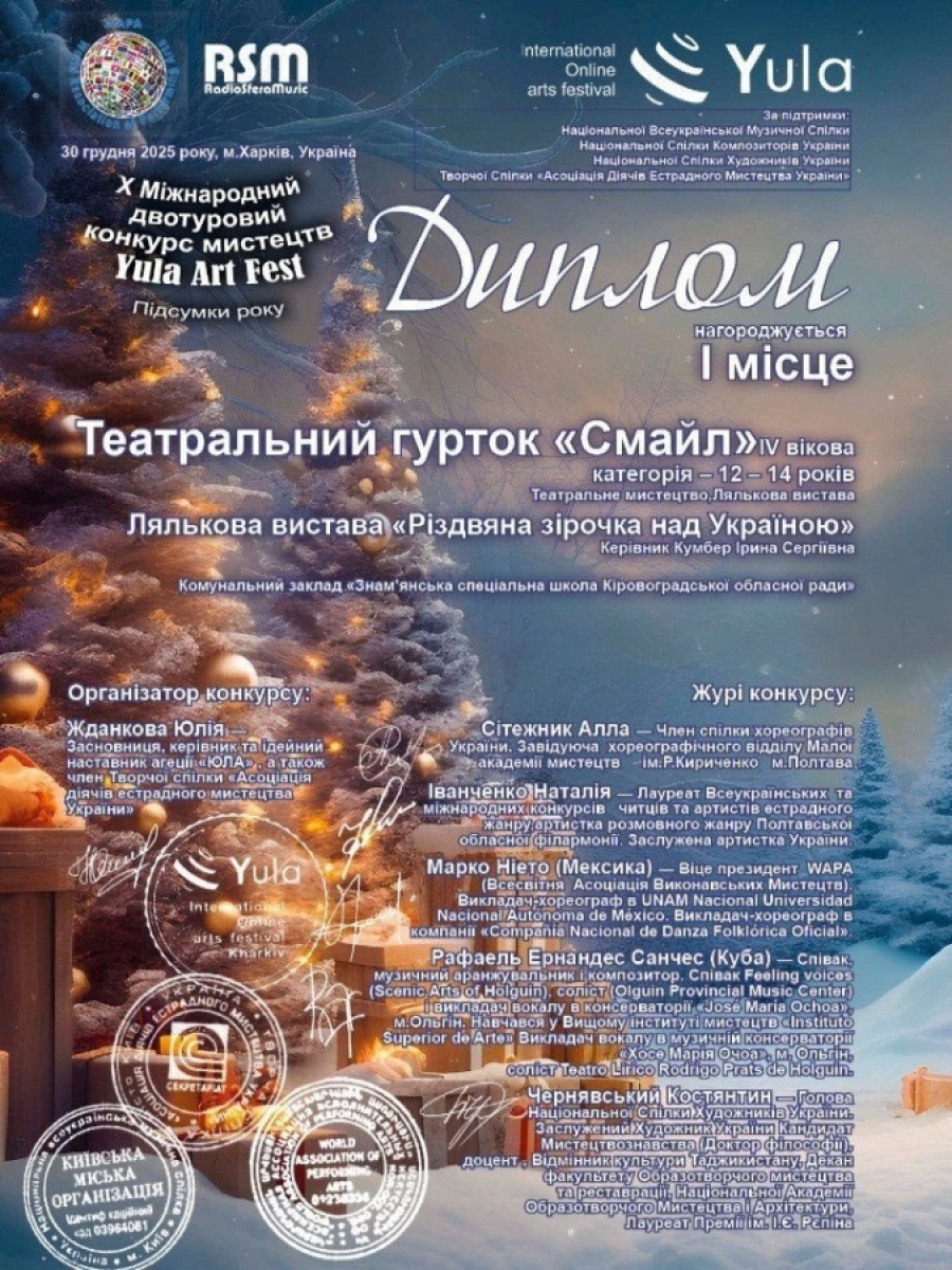 Вихованці театрального гуртка «Смайл» Знам’янської спеціальної школи Кіровоградської обласної ради під керівництвом Ірини Кумбер здобули Диплом І ступеня на X Міжнародному двотуровому конкурсі мистецтв «YULA ART FEST».