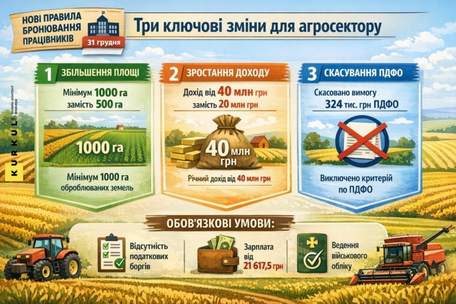 Оновлено критерії для отримання статусу критичного підприємства та бронювання працівників: поріг площі землі підвищили до 1000 га, мінімальний річний дохід — до 40 млн грн, а критерій сплати ПДФО за попередній квартал (від 324 тис. грн) скасували.