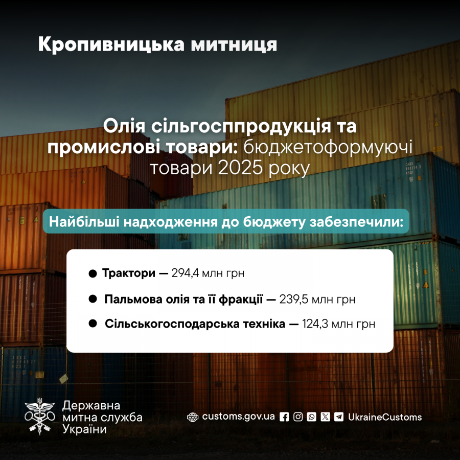 За результатами 2025 року найбільший внесок у формування митних надходжень у зоні діяльності Кропивницької митниці забезпечили трактори та сільськогосподарська техніка, а також рослинні олії.