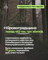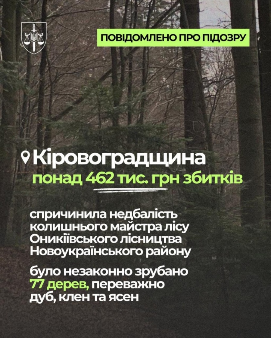 На Кіровоградщині повідомлено про підозру колишньому майстру лісу Оникіївського лісництва у службовій недбалості, що спричинила тяжкі наслідки державним інтересам (ч. 2 ст. 367 КК України). Через неналежний контроль за збереженням лісу було незаконно зрубано 77 дерев порід дуб, клен та ясен, а державі завдано понад 462 тис. грн збитків.