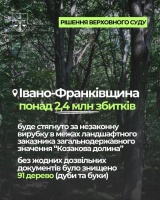 На Івано-Франківщині з лісокористувача стягнуть понад 2,4 млн грн збитків за незаконну вирубку в межах ландшафтного заказника загальнодержавного значення «Козакова долина». Тут без дозвільних документів знищено 91 дерево, зокрема дуби та буки. Верховний Суд 11 лютого 2026 року підтвердив законність рішень попередніх інстанцій і залишив касаційну скаргу відповідача без задоволення.