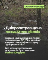 У Дніпропетровській області до суду скеровано обвинувальний акт щодо колишніх директора та інженера однієї з філій ДП «Ліси України». За даними слідства, вони організували санітарні рубки без належних дозволів у межах регіонального ландшафтного парку «Дніпровські ліси». Унаслідок цього незаконно зрубано майже 500 дерев, а довкіллю завдано понад 22 млн грн збитків (ч. 2 ст. 28, ч. 3 ст. 365, ч. 4 ст. 246 КК України).