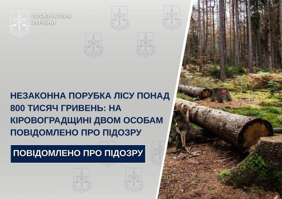 За процесуального керівництва прокурорів Спеціалізованої екологічної прокуратури Кіровоградської обласної прокуратури двом мешканцям області повідомлено про підозру у незаконній порубці дерев, вчиненій за попередньою змовою групою осіб, що спричинила тяжкі наслідки для довкілля (ч. 4 ст. 246 КК України).
