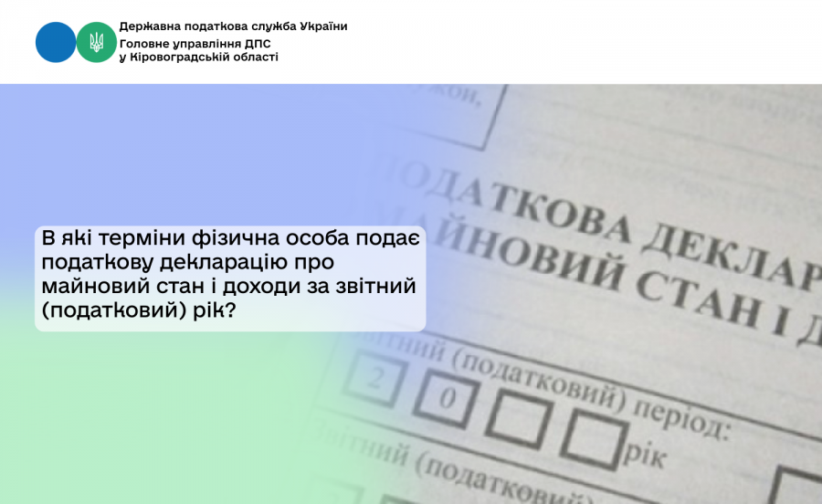 Головне управління ДПС у Кіровоградській області інформує, що відповідно до п.п. 49.18.4 п. 49.18 ст. 49 Податкового кодексу України від 02 грудня 2010 року № 2755-VI із змінами та доповненнями (далі – ПКУ), податкова декларація про майновий стан і доходи (далі – Декларація) подається за базовий звітний (податковий) період, що дорівнює календарному року для платників податку на доходи фізичних осіб, у тому числі самозайнятих осіб – до 1 травня року, що настає за звітним, крім випадків, передбачених розд. IV ПКУ.