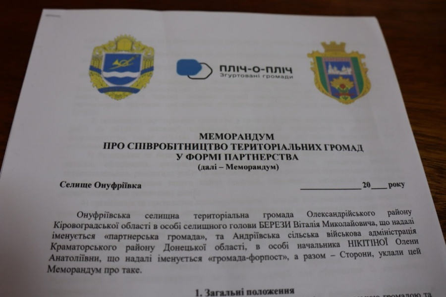 Онуфріївська селищна територіальна громада та Андріївська сільська військова адміністрація Краматорського району Донецької області офіційно закріпили свої наміри про співпрацю. В межах національного проєкту «Пліч-о-пліч: згуртовані громади» сторони підписали Меморандум про співробітництво у формі партнерства.