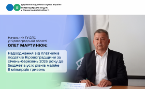 Як зазначив начальник Головного управління ДПС у Кіровоградській області Олег Мартинюк у коментарі місцевим ЗМІ, за січень-березень 2026 року платники податків Кіровоградської області забезпечили надходження до зведеного бюджету (без урахування єдиного внеску на загальнообов’язкове державне соціальне страхування) 5,9 млрд грн податкових платежів. Порівняно з січнем-березнем 2025 року надходження зросли на 656,1 млн гривень або 12,5 відсотків.