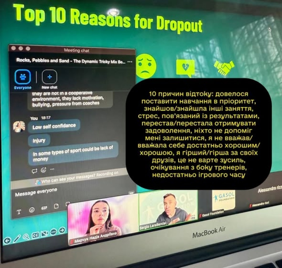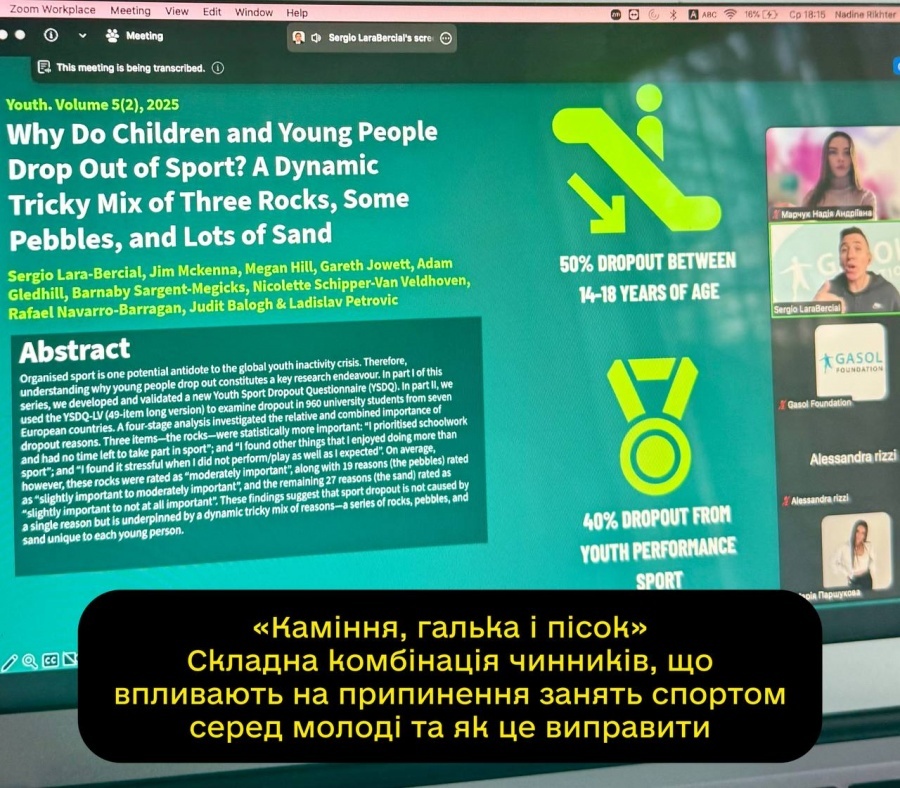 Під час вебінару було представлено результати масштабного дослідження причин відтоку молоді зі спорту. Зокрема, зазначено, що близько 50% підлітків віком 14–18 років припиняють займатися спортом, а у спорті високих досягнень цей показник сягає 40%.