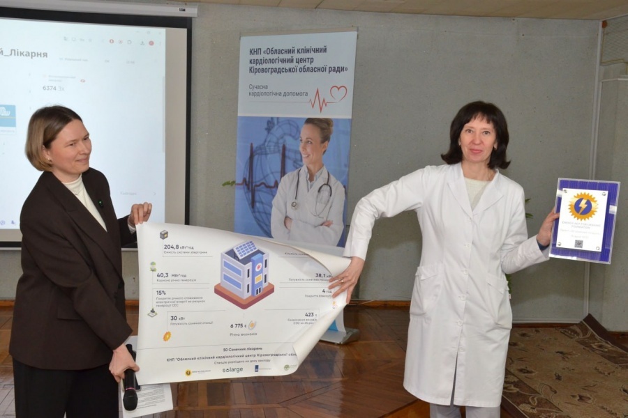 Сонячна електростанція потужністю 30 кВт почала працювати на території комунального некомерційного підприємства «Обласний клінічний кардіологічний центр Кіровоградської обласної ради». Вона дозволить медичному закладу повноцінно працювати навіть під час тривалого відключення електроенергії та економити понад 300 тисяч гривен на рік. Електростанцію побудували в партнерстві з українськими благодійними організаціями за фінансування Агентства підприємництва Нідерландів.