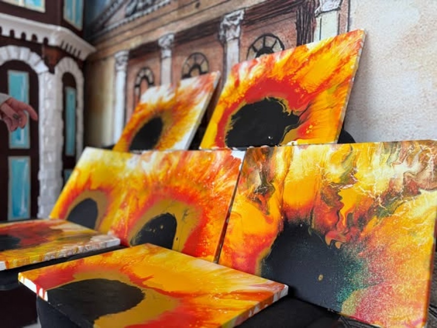 Малювання соняха у техніці флюїд-арт об’єднало дітей і батьків у спільному творчому процесі. Маріупольці працювали з кольором, спостерігали за рухом фарб і створювали власні унікальні роботи. Жовті, помаранчеві та коричневі відтінки формували образ соняха, наповнений теплом і настроєм.