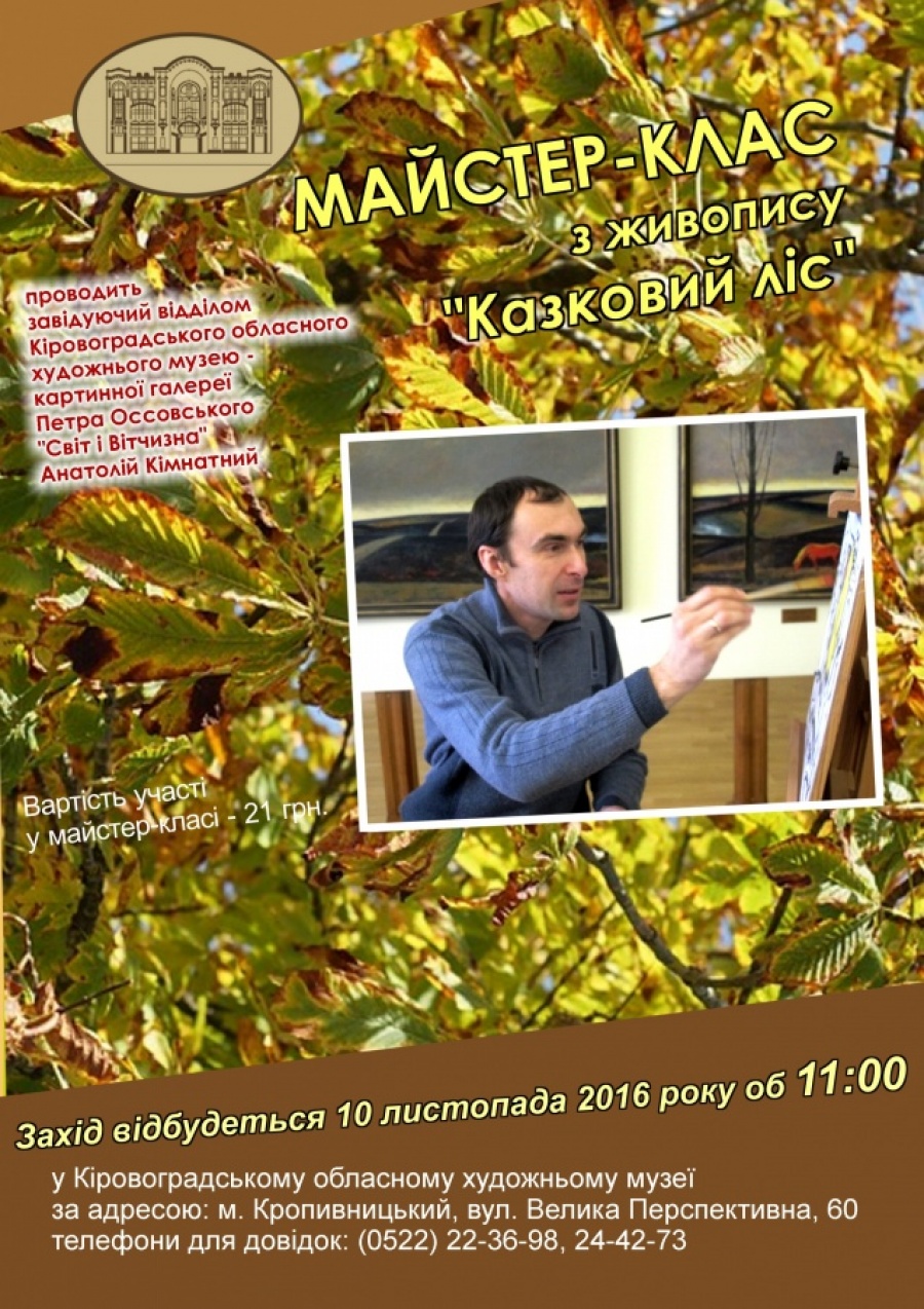 Проводить: Анатолій Кімнатний – завідуючий відділом обласного художнього музею – картинної галереї Петра Оссовського «Світ і Вітчизна»