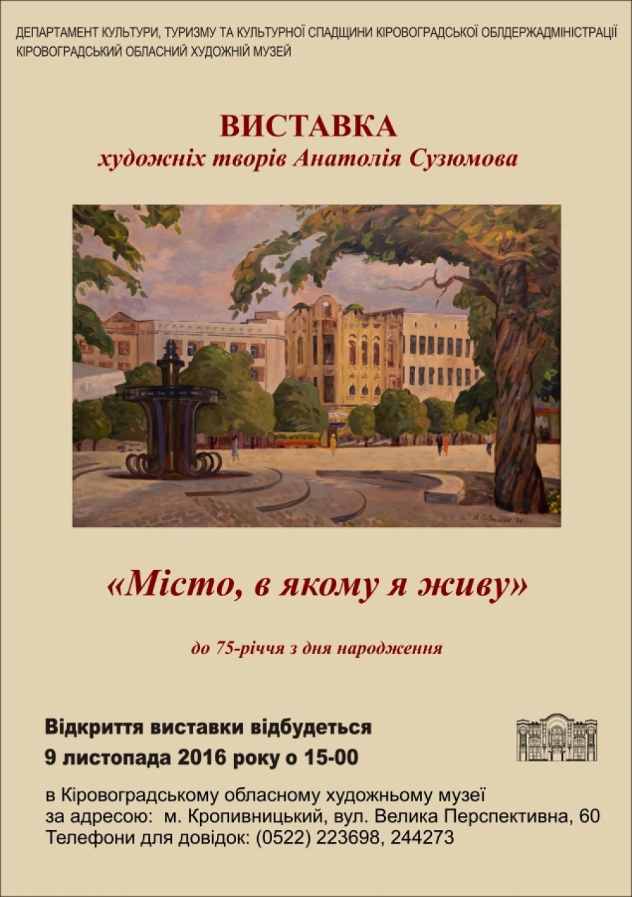9 листопада 2016 року о 15.00 відбудеться відкриття ювілейної виставки робіт Анатолія Сузюмова «Місто, в якому я живу» до 75-річчя від дня народження митця.