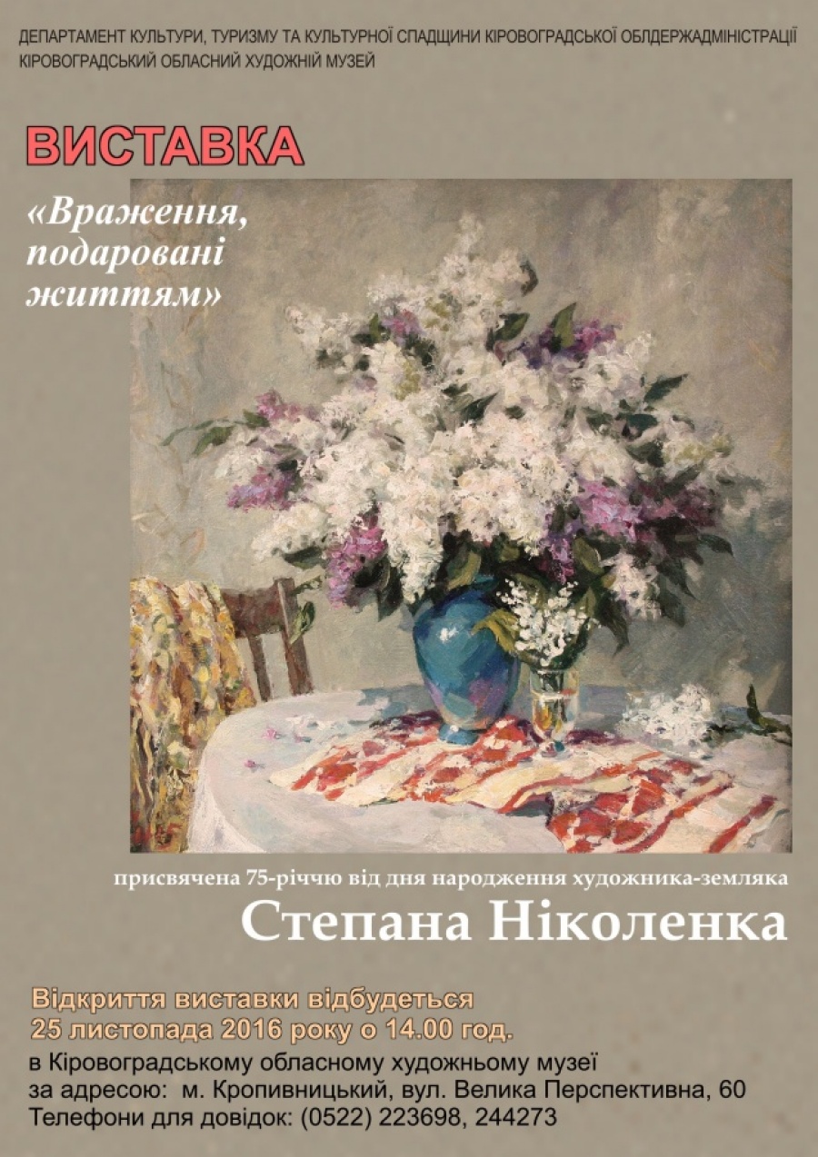 25 листопада 2016 року о 14.00 буде відкрито персональну виставку художника –земляка Степана Ніколенка «Враження, подаровані життям» до 75 –річчя з дня народження митця. Вхід на відкриття виставки вільний