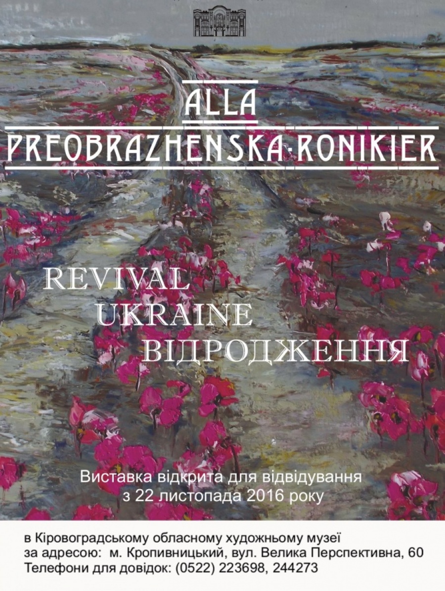 22 листопада 2016 року буде розгорнуто виставку Алли Преображенської -Ронікер «REVIVAL UKRAINE ВІДРОДЖЕННЯ»