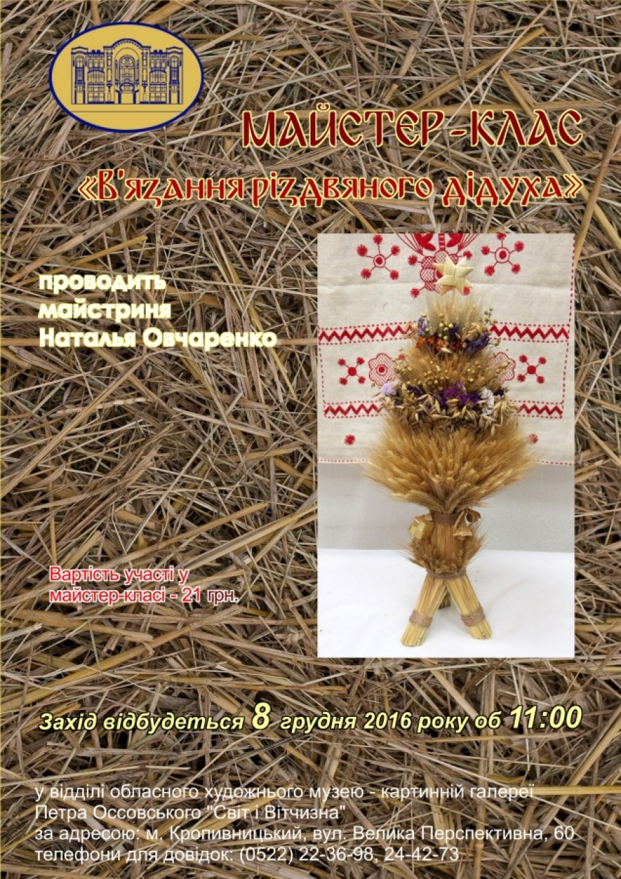 8 грудня 2016 року об 11.00 у відділі музею – картинній галереї Петра Оссовського «Світ і Вітчизна» буде проведено майстер-клас «В’язання різдвяного дідуха»