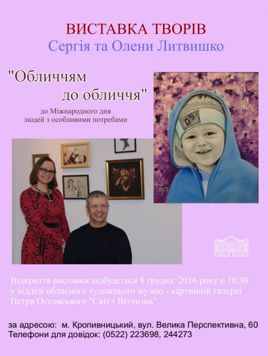8 грудня 2016 року об 10.30 у відділі музею – картинній галереї Петра Оссовського «Світ і Вітчизна» буде відкрито виставку творів Сергія та Олени Литвишків «Обличчям до обличчя» (м. Світловодськ) до Міжнародного дня людей з особливими потребами. Вхід на відкриття виставки вільний