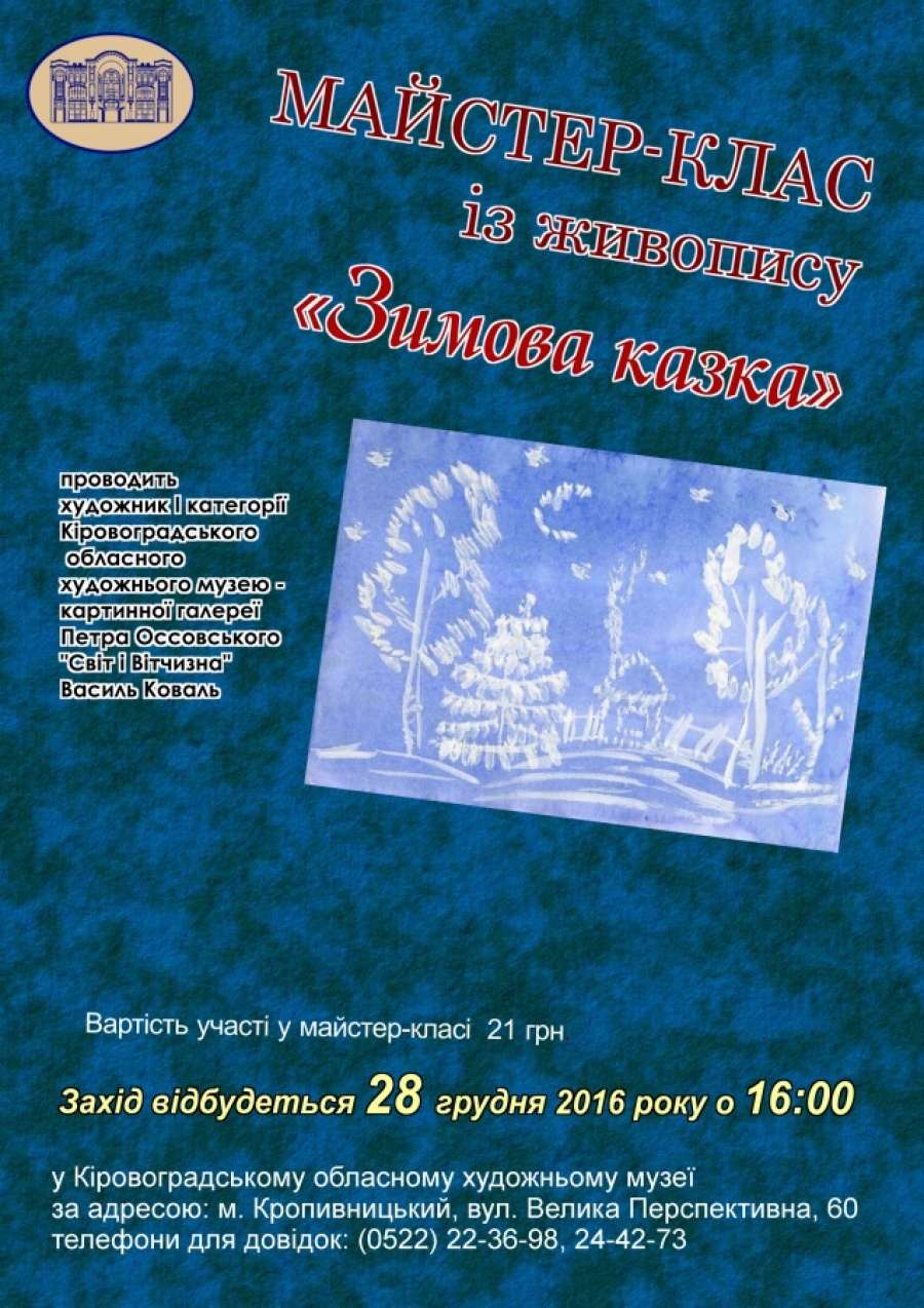 28 грудня 2016 року о 16.00 у відділі музею – картинній галереї Петра Оссовського «Світ і Вітчизна» буде проведено майстер-клас із живопису «Зимова казка»
