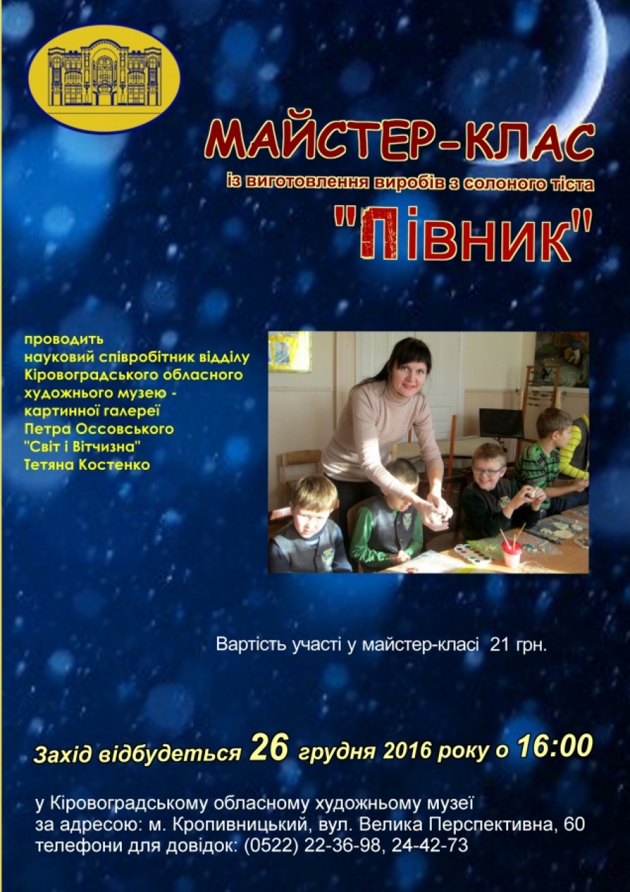 26 грудня 2016 року о 16.00 у відділі музею – картинній галереї Петра Оссовського «Світ і Вітчизна» буде проведено майстер-клас із виготовлення виробів з солоного тіста «Півник»