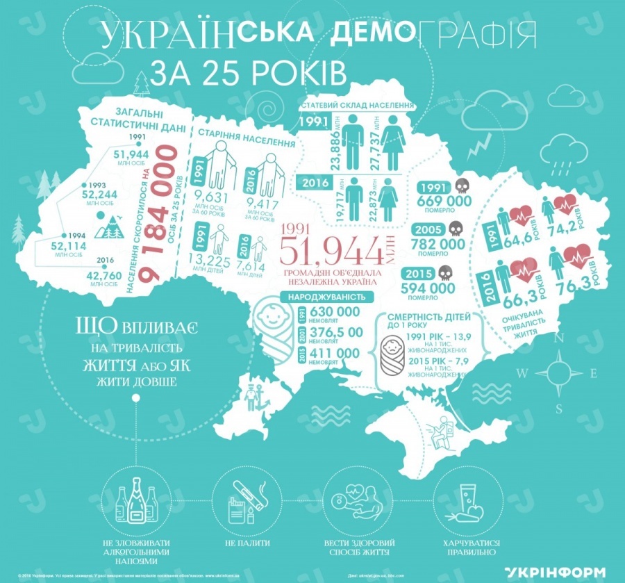 Хотя Украина всегда занимала высокие строчки в рейтинге Европы по количеству населения, с 1991 года место нашей страны на демографической карте мира нестабильно. Общеизвестный факт, что после 1993 года количество граждан неуклонно уменьшается. И сейчас, в 25-летие независимости, население составляет около 42,7 миллиона человек.