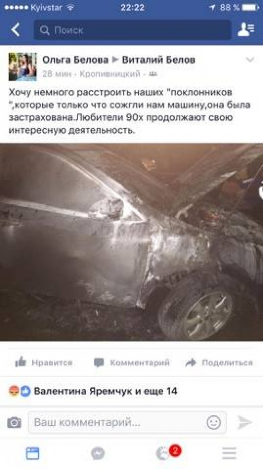 "Хочу немного расстроить наших "поклонников", которіе только что сожгли нам машину, она была застрахована. Любители 90х продолжают свою интересную деятельность".