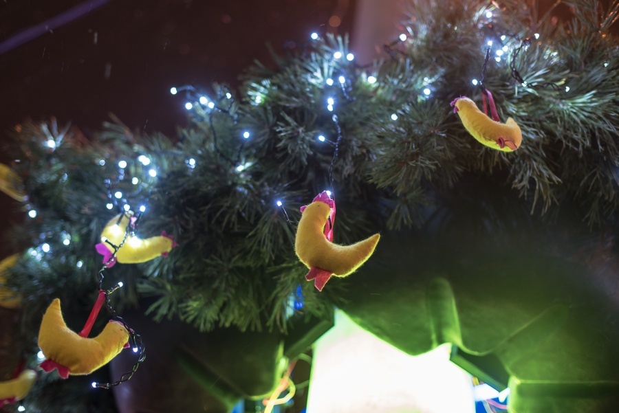 Святкові прикраси для соснових композицій виготовили своїми руками учні кіровоградських шкіл №16, №20, №9, гімназії ім.Шевченка та гімназії нових технологій навчання. Оцінити роботи учнів того чи іншого навчального закладу можуть всі охочі – під кожною композицією розміщена табличка з номером школи, яка готувала іграшки.