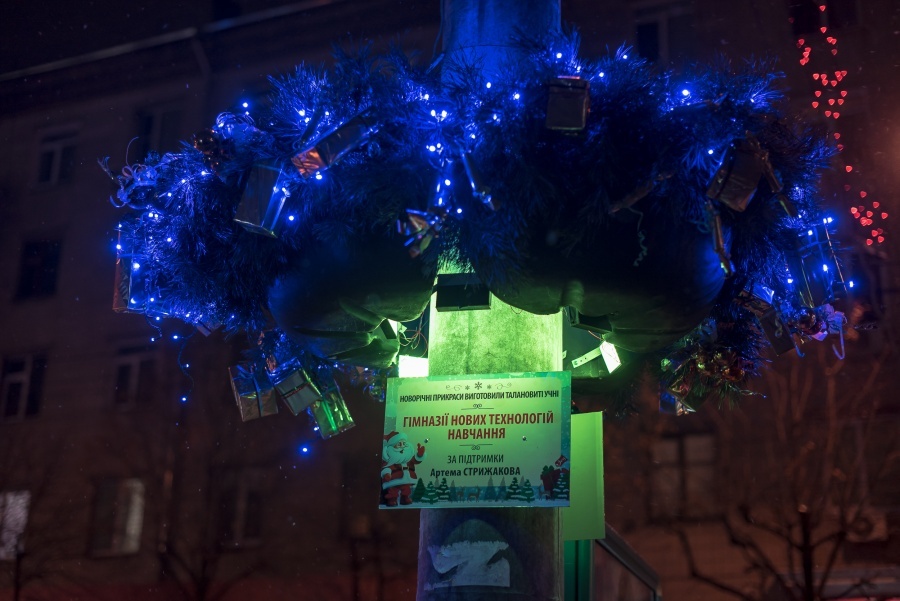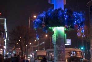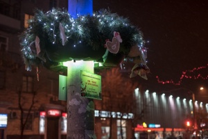 У центрі Кіровограда на зупинці громадського транспорту біля готелю «Київ» у підвісних вазонах з’явилися соснові композиції із новорічними іграшками. Ініціативу вже третій рік поспіль реалізує громадський діяч Артем Стрижаков.