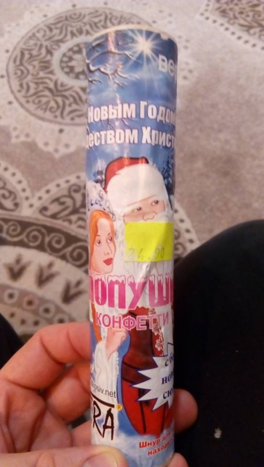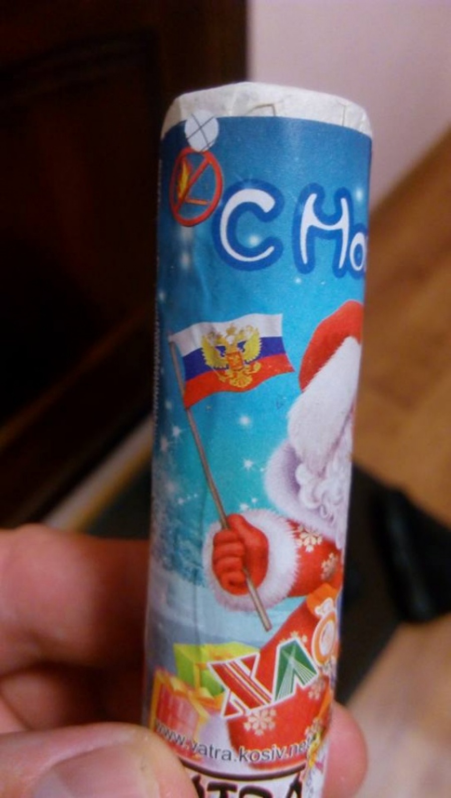 Він розповів, що придбав у магазині кілька хлопавок для сина, а як той почав їх розглядати то побачив на них зображеного російського Діда Мороза з триколором у руках.