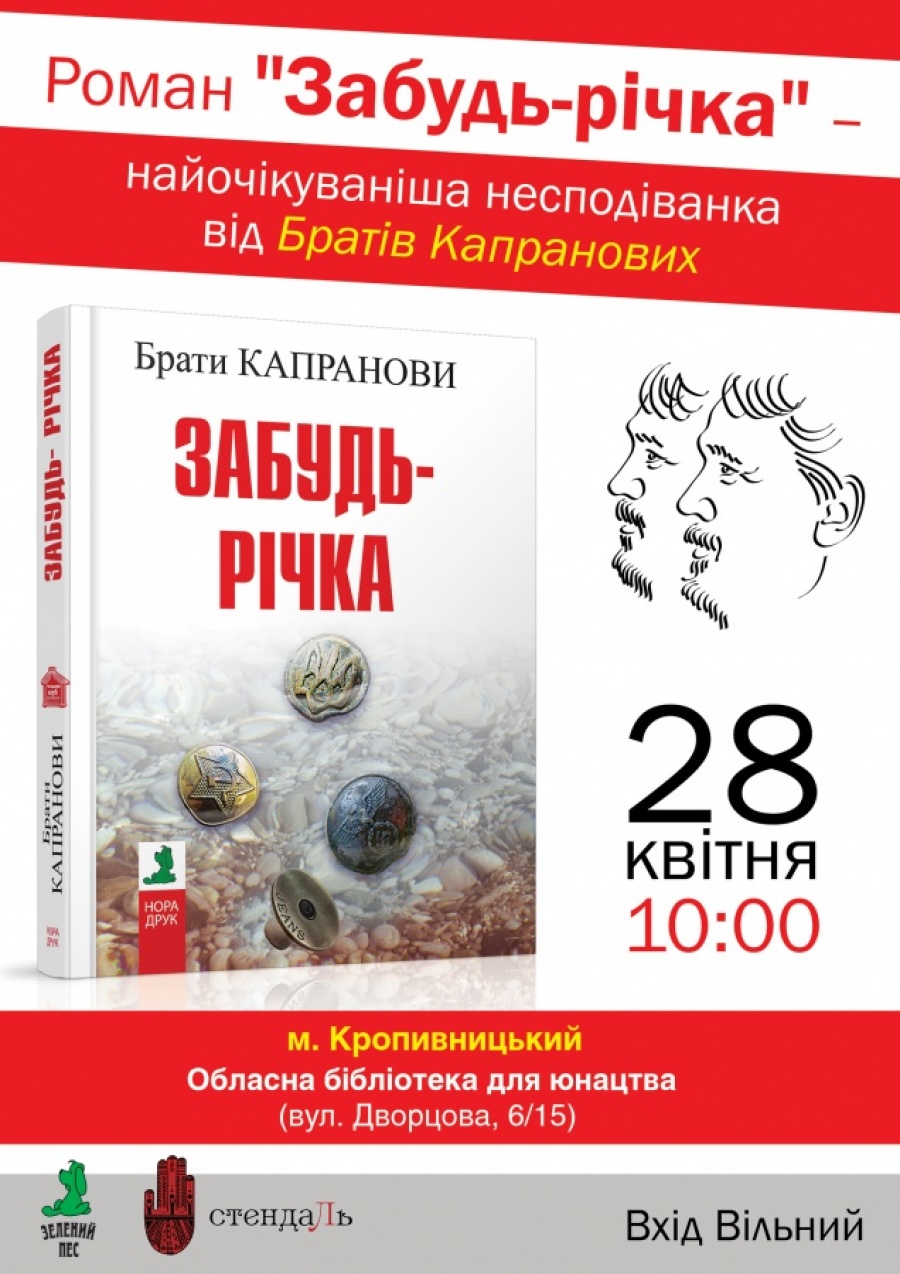 Відомі українські письменники та видавці Брати Капранови презентують новий історичний роман «Забудь-річка» 28 квітня 2017 року, о 10:00. Захід відбудеться у Кіровоградській бібліотеці для юнацтва (вул. Дворцова, 6/15).