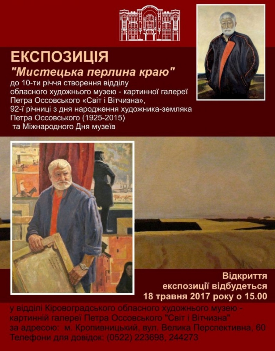 18 травня о 15.00 у відділі Кіровоградського обласного художнього музею – картинній галереї Петра Оссовського «Світ і Вітчизна» відбудеться відкриття експозиції "Мистецька перлина краю" до 10-ти річчя створення відділу обласного художнього музею - картинної галереї Петра Оссовського «Світ і Вітчизна», 92-ї річниці з дня народження художника-земляка Петра Оссовського (1925-2015) та Міжнародного Дня музеїв.