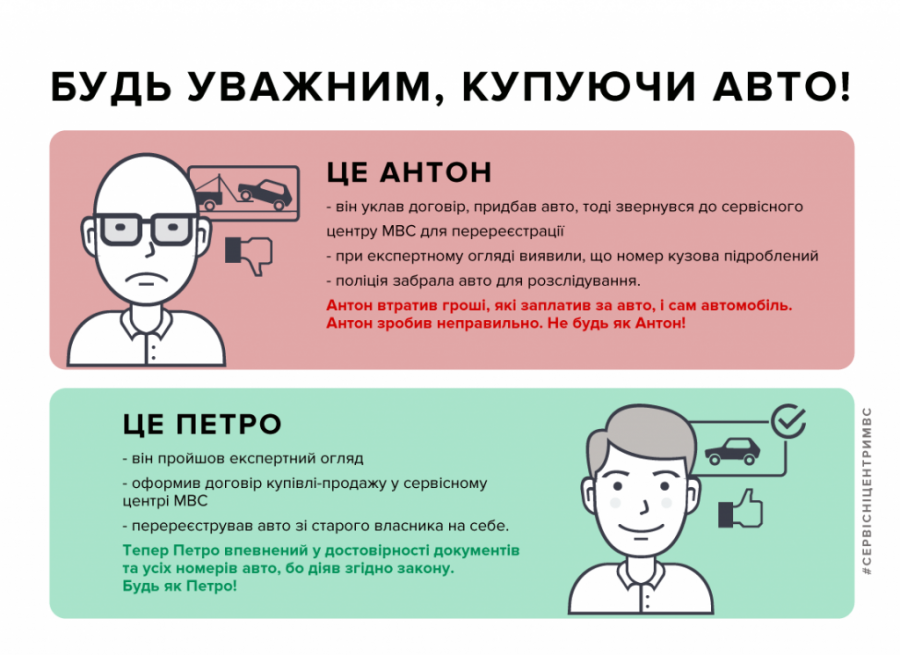 Уберегтися від купівлі транспортного засобу з підробленими номерами кузова чи двигуна можна, якщо звернутися до сервісного центру МВС для оформлення договору купівлі – продажу та перереєстрації авто під час якої проводиться огляд ТЗ фахівцем НДЕКЦ МВС. Договір купівлі-продажу укладається безкоштовно і заповнюється адміністратором в електронній формі.
