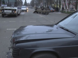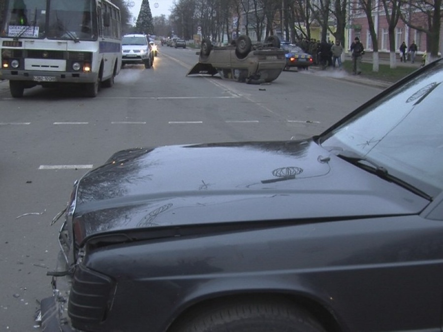 Автомобілі "Mercedes" та "Нива" зіткнулися на Соборному проспекті у Олександрії, що на Кіровоградщині, 2 січня. Внаслідок аварії "Нива" перекинулася на дах.