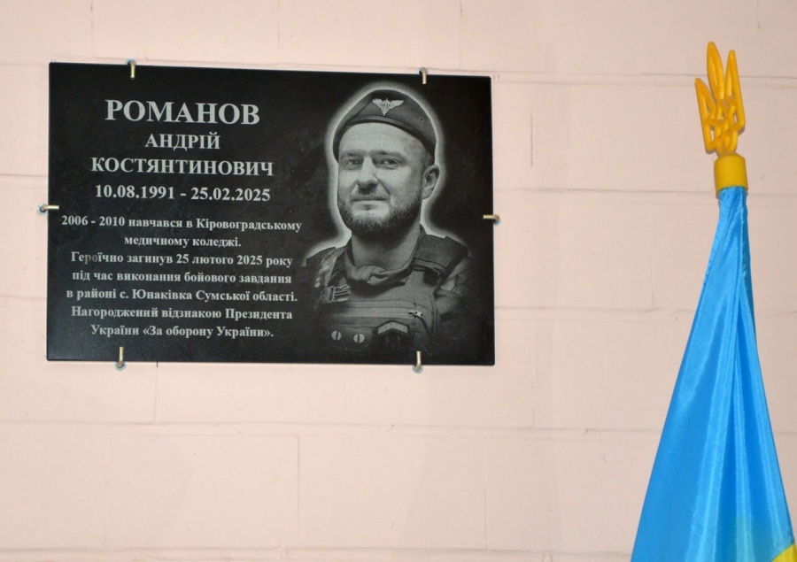 У Кіровоградському медичному фаховому коледжі ім. Є.Й.Мухіна сьогодні, в День захисників і захисниць України, відкрили меморіальну дошку на честь випускника закладу Андрія Романова, фельдшера медичного пункту аеромобільного батальйону 80-ї окремої десантно-штурмової Галицької бригади, який загинув 25 лютого 2025 року під час виконання бойового завдання в районі населеного пункту Юнаківка, Сумського району, Сумської області.