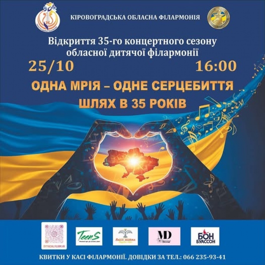Незважаючи на це, обласна дитяча філармонія відкриває 35-й концертний сезон красивою, насиченою патріотичною програмою, у якій братимуть участь найталановитіші діти міста. Колективи Кіровоградського обласного ЦДЮТ: народний художній хореографічний ансамбль «Час пік», народний хореографічний ансамбль «Росинка», народний художній колектив студія вокального мистецтва «Антарес», а також народний художній колектив України, театр танцю «В гостях у казки», народний художній колектив України хореографічний ансамбль «Надія», народний хореографічний ансамбль «Пролісок». КЗ «Центральноукраїнський науковий ліцей-інтернат Кіровоградської обласної ради», народний художній колектив студія естрадної дитячої пісні "Вікторія" Кіровоградського обласного ЦДЮТ, зразковий хореографічний ансамбль «Олена», зразковий аматорський колектив студія хореографічного мистецтва «Авангард» БК ПАТ НВП «Радій», учні музичної школи №1 ім.Г.Г.Нейгауза м.Кропивницького, КЗ "Музичної школи №2 ім. Ю.С.Мейтуса м.Кропивницького", Музичної школи №3 м.Кропивницького, Музичної школи №4 м.Кропивницького, Дитячої школи мистецтв м.Кропивницького та солісти обласної філармонії.