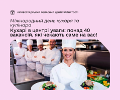 - 37 вакансійдля кухарів - у м. Кропивницький, м. Світловодськ, м. Олександрія, м. Мала Виска, с. Нова ПавлівкаКропивницького району, с-щіПобузьке.
