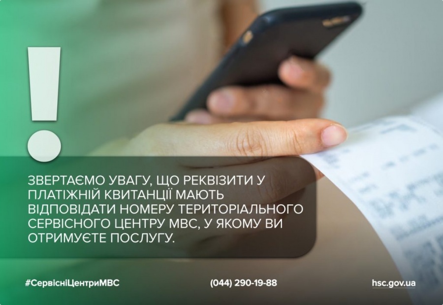 Звертаємо увагу, що реквізити у платіжній квитанції мають відповідати номеру територіального сервісного центру МВС, у якому ви отримуєте послугу.