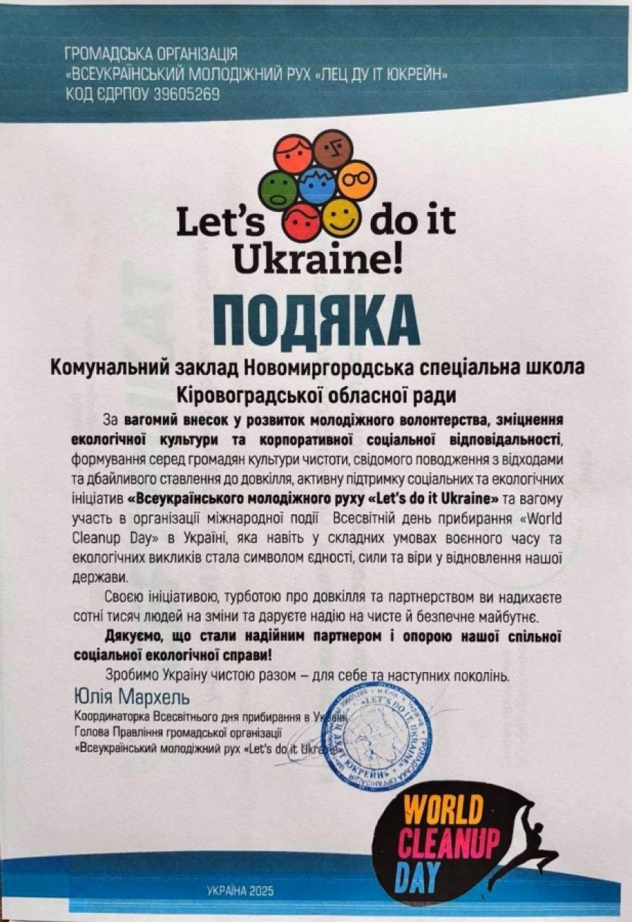 Учні комунального закладу «Новомиргородська спеціальна школа Кіровоградської обласної ради» отримали офіційну подяку від Громадської організації «Всеукраїнський молодіжний рух «Let's do it Ukraine»».